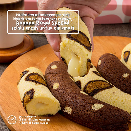 Hadirnya Banana Royal Spesial menambah koleksi dari varian Banana lainnya. Spesial tentunya berbeda dengan produk serupa, mulai dari warna dan rasanya pasti tidak sama. Penambahan unsur Coklat pada fla dan Choco Chips di dalamnya membuat Banana Royal Spesial begitu diminati sebagai oleh-oleh dan juga camilan dikala siang hari. Tentunya dilengkapi dengan packaging yang sangat aman dan menarik membuat Banana Royal Spesial pas untuk hantaran pada saat acara besar keluarga atau kantor. Produk ini memiliki dimensi ukuran sebagai berikut panjang 27,3 cm, lebar 14,7 cm dan tinggi 3,8 cm.