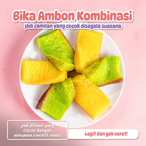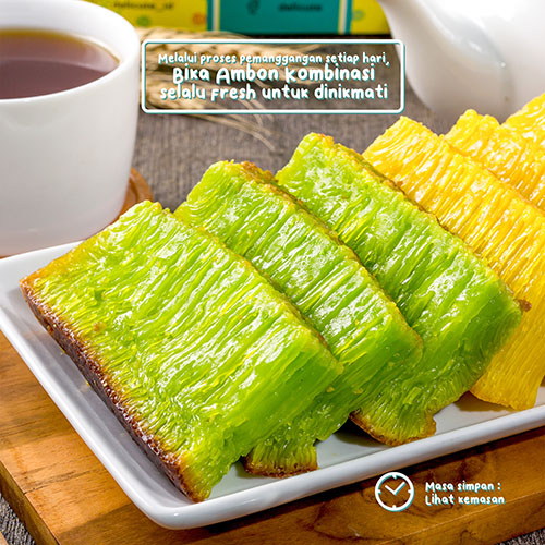 Makanan khas dari Medan ini punya sensasi unik setiap kali digigit. Dimasak dengan waktu yang cukup lama terbuat dari tepung tapioka, telur, gula dan santan. Bika Ambon Kombinasi Delicute terdiri dari bika original (warna kuning) yang manis dan bika pandan (warna hijau) yang wangi. Dengan tekstur bersarang yang menjadi ciri khas dan memberi sensasi sendiri saat digigit. Rasa manis yang pas, tekstur yang gak seret dan wangi khas menjadikan Bika Ambon Kombinasi cocok dinikmati bersama keluarga atau suguhan untuk tamu. Memiliki ukuran produk 20 cm x 11 cm x 5,5 cm membuatnya mudah dibawa untuk dijadikan buah tangan jika Anda bepergian.