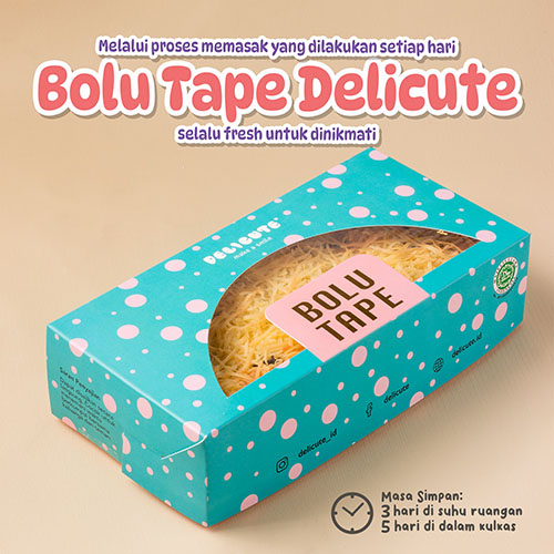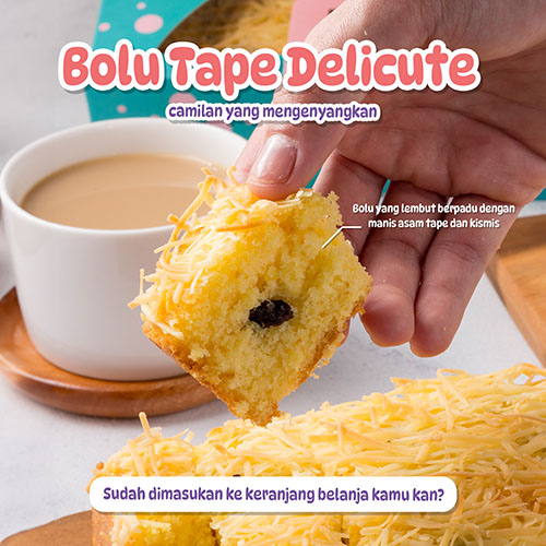 Fermentasi singkong menjadi tape menghasilkan wangi yang segar khas dan rasa yang manis. Kreasi tape dalam sebuah adonan tepung yang dicampur dengan bahan baku bolu menghasilkan makanan jadul yang membawa ke memori indah. Bolu Tape yang legendari hadir untuk memberikan sensasi camilan yang berbeda. Ditaburi toping keju yang melimpah dan isian kismis segar menjadikan bolu tape Delicute semakin lezat untuk dinikmati. Bolu yang lembut dan tidak seret berpadu dengan sensasi tape yang segar dan wangi. Bolu Tape Delicute memiliki boks berukuran 22,5 cm x 11,3 cm x 5,5 cm.