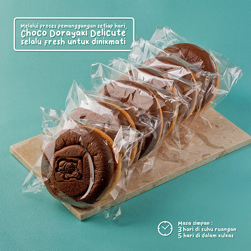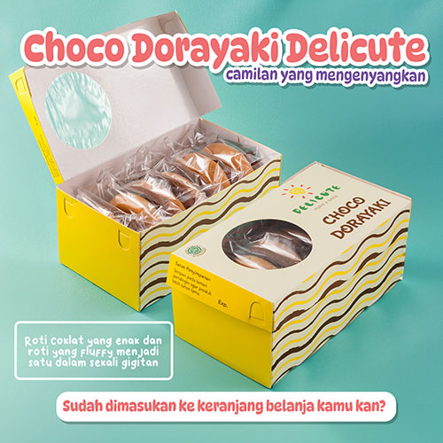 Anda mungkin sangat mengenal makanan ini dari negeri Sakura, begitu pun Delicute yang terinspirasi untuk membuat Dorayaki dengan ciri khas tersendiri. Roti yang sangat fluffy dan super lembut ditambah dengan filling coklat yang manis membuat Choco Dorayaki Delicute akan menjadi kegemaran anak dan dewasa. Terbungkus plastik pada setiap satuannya memberikan jaminan kebersihan sampai diterima oleh Anda. Cocok sekali untuk pendamping bekal makan siang atau menemani waktu lembur Anda di kantor. Dikemas dalam boks berukuran 21 cm x 11,5 cm x 9,5 cm yang sangat cute dan menggemaskan berisikan enam (6) set Choco Dorayaki kesukaan Anda dan keluarga.